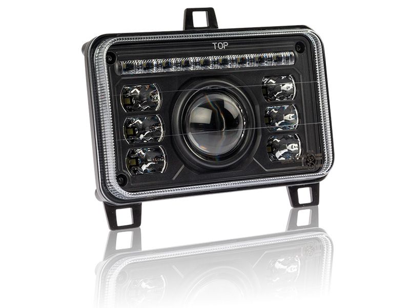Agriline ajovaloumpio 4x6, led parkilla, upotettava, H4 pistokkeella, polykarbonaattilinssi, alumiinirunko, teoreettinen valoteho 6400lm, mitattu 3529lm, virrankulutus: Low 13.7V/ 1.48A, High 13.7V/ 4.53A, 6000K, IP68, ECE R148, R149, R10, CISPR 25 Class 4. Valmet / Valtra: 65-sarja, Mezzo, Mega
