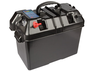 Muovinen, hihnakiinnitys, sis. kiinnikkeet. sisämitat 354x185x230mm (60038 akku sopii), Kannessa 1kpl tup.syt.pistorasia, 10A ja 30A sulakkeet, 1kpl USB-pistorasia (2-porttia max. 2,1A/5V). (+) ja (-) navat siipimutterikiinnityksellä. Akun varaustilan indikaattori.