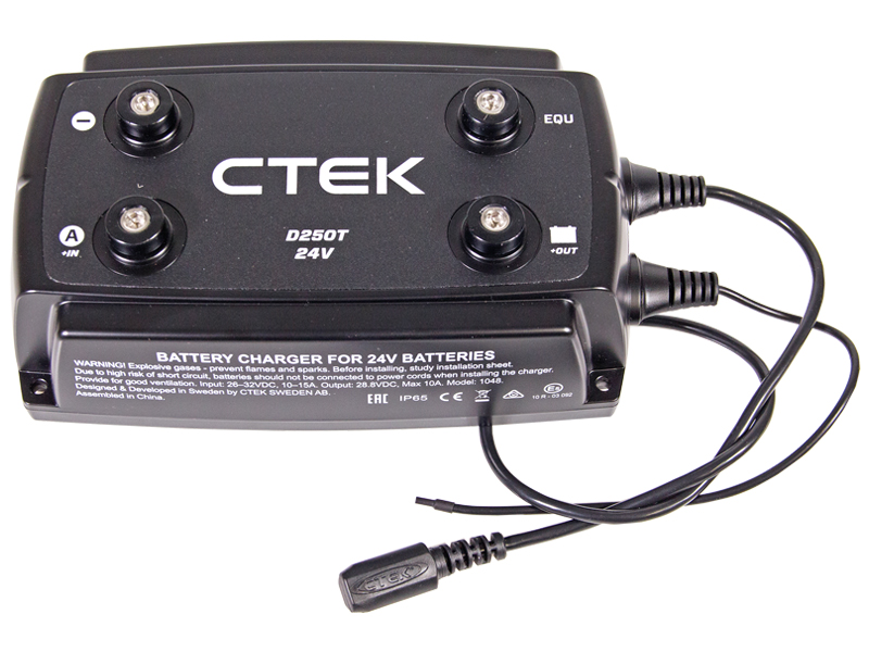 D250T on täysautomaattinen nelivaiheinen DC/DC-laturi, joka tuottaa jopa 10 A virtaa lyijyhappotyyppisiin 24V:n käyttöakkuihin. Laturi on myös akkuerotin, joka erottaa käyttöakun ja käynnistysakun toisistaan estääkseen käynnistysakun tyhjenemisen, kun moottori ei ole käynnissä.