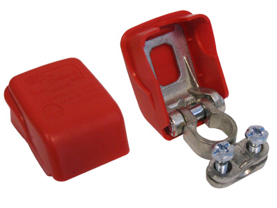 Racon Easy Click akkukenkä: nopea asennus ja irrotus. 16-70mm² kaapelille, pulttikiinnitys ø19mm napaan. Tinattua messinkiä. Punaisella muovisuojuksella.