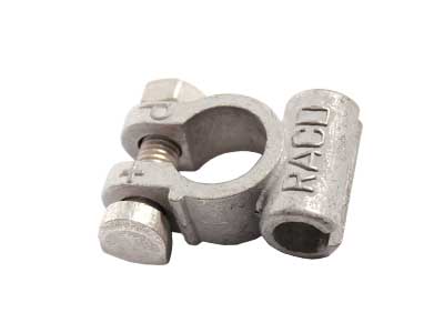 Laadukas Racon juotettava + akkukenkä tinattua messinkiä. Huom plus/+ ja miinus/- napa ovat perinteisesti erikokoisia, joten plus/+ kenkä ei sovi miinus napaan.
