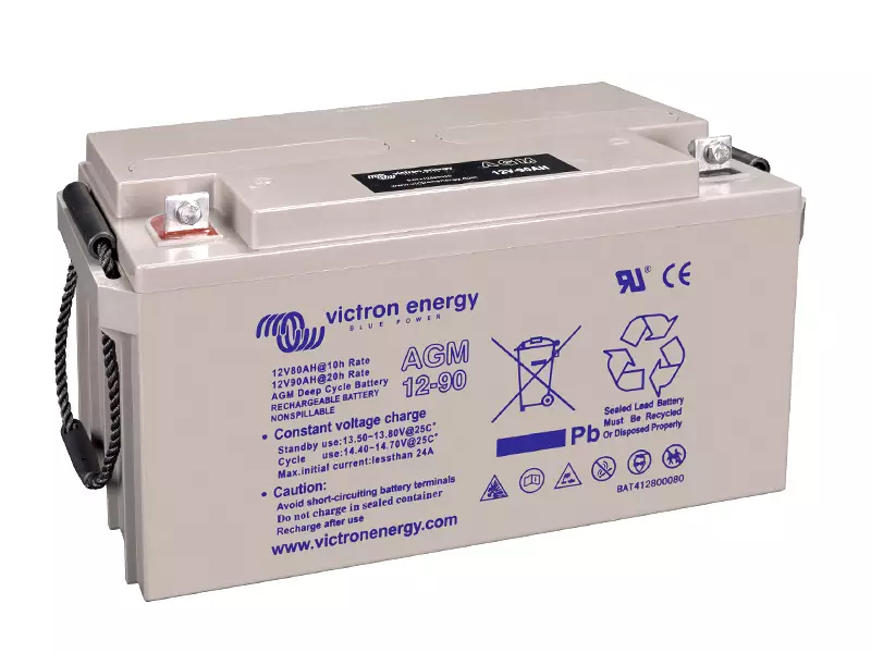 BAT412800085 Victron Energy Deep Cycle 90Ah AGM-akku sopii kulutuskäyttöön ajoneuvoissa, veneissä, matkailuautoissa. Sopii oivallisesti suuria purkausvirtoja vaativiin sovelluksiin. Tyypillisiä esimerkkejä ovat invertterit, keulapotkurit ja vinssit. Akut täyttävät sekä CE- että UL-vaatimukset ja ne on pakattu ABS-muovista valmistettuihin koteloihin.