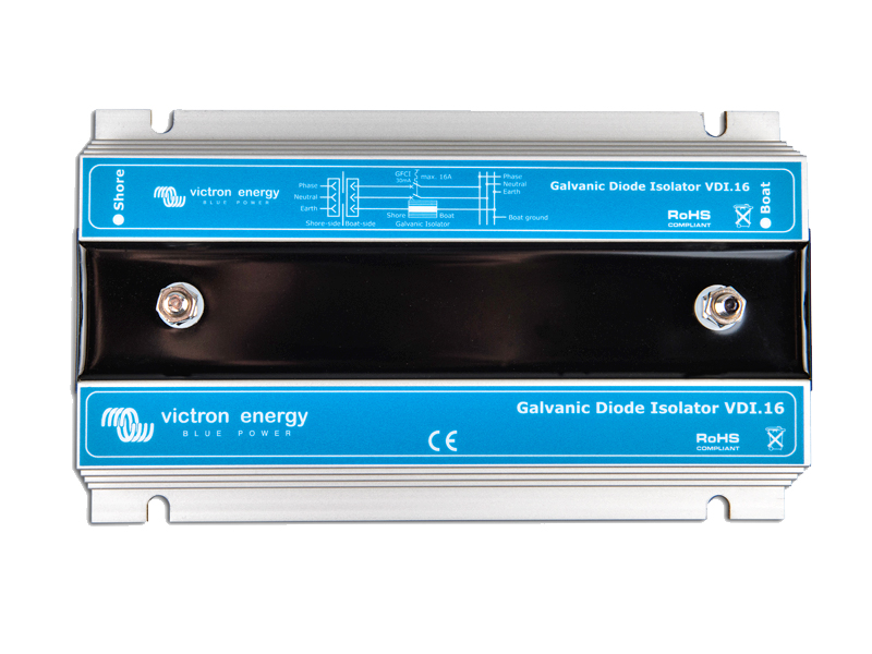 Kuvaus: Elektrolyyttisen korroosion estoon. Galvaaninen erotin estää matalajännitteiset tasavirrat, jotka muutoin kulkisivat veneeseen maasähköliitännän suojamaajohdon kautta ja voivat aiheuttaa veneen vesilinjan alaisten metallisten osien (potkurin, läpivientihelojen, potkuriakselin jne) syöpymistä. Galvaaninen erotin koostuu kahdesta vastakkain ja rinnakkain kytketystä diodista. Diodit sallivat virrankulun molempiin suuntiin, mutta vain tietyn kynnysjännitteen yläpuolella. Näissä erottimissa kynnysjännite on noin 1.4 VDC.---Erotin asennetaan välittömästi veneen 230V:n liitännän "taakse". Galvaanisen erottimen myötäjännite on suurempi kuin tyypillisten veneenrungoissa ja osissa käytettyjen metallien potentiaaliero → potentiaalijännite ei pääse aiheuttamaan virtaa ja galvaaninen erotin estää elektrolyyttisen virran kulun. Jos AC-virtapiirissä esiintyy (korkeampi) virhejännite, diodit sallivat virran läpikulun ja vikavirtasuoja katkaisee virransyötön. Hetkellinen virtapiikki max (20 ms) 1600A, liitännät M6.