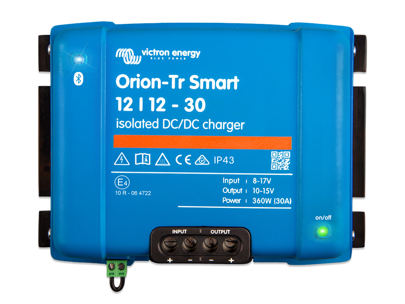 Orion-Tr Smart DC-DC 12V/12V 30A (360W) Isolated charger - on ammattikäyttöön suunniteltu adaptiivisella 3-vaiheisella lataustoiminnolla varustettu DC-DC-laturi, joka sisältää langattoman Bluetooth-yhteyden.