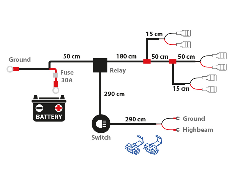 Yleismallinen relejohtosarja kolmen lisävalon asennukseen. Sarjassa ei ole merkkikohtaisia liittimiä, vaan 3 x lattaliittimet.
