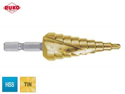 Kuvaus: ø1: 4.0mm, ø2: 20.0mm, porrasluku: 9 (90° ─ 2mm nousu), ø3: 6.35x27mm ─ 1/4" kuusiokara, L1: 81mm, CBN hiottu kierukkaura: hiljainen käyttöääni, laadukas porausjälki, optimoitu lastunpoisto suojelee leikkauspintoja ja vähentää epätasaisuuksia, pitkätkin lastut poistuvat katkeamattomina, kartiomainen muoto helpottaa terän ulosvetämistä. TiN-pinnoite: kulutusta kestävä titaaninitridi suojaus lisää kovuutta, omaa hyvin pienen kitkakertoimen, pidentää käyttöikää, jäähdytys työstön aikana ei välttämätöntä, mutta suositeltavaa