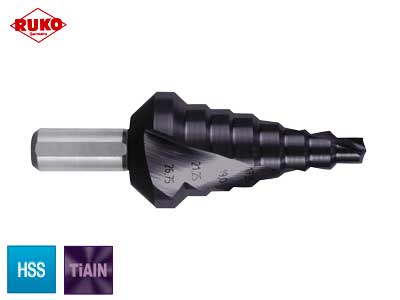 ø1: 6.0mm, ø2: 26.75mm, 8 steps 90°: 6 - 9 - 11.4 (PG7) - 14 (PG9) - 17.25 (PG11) - 19 (PG13.5) - 21.25 (PG16) - 26.75 (PG21), ø3: 10.0mm, L1: 75mm, CBN hiottu kierukkaura: hiljainen käyttöääni, laadukas porausjälki, optimoitu lastunpoisto suojelee leikkauspintoja ja vähentää epätasaisuuksia, pitkätkin lastut poistuvat katkeamattomina, kartiomainen muoto helpottaa terän ulosvetämistä. TiAlN-pinnoite: kulutusta kestävä titaanialumiininitridi suojaus lisää kovuutta, omaa hyvin pienen kitkakertoimen, pidentää käyttöikää, mahdollistaa käytön kuivana leikkaavilla koneilla ilmän jäähdytystä