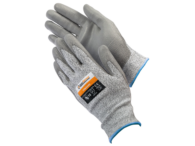 Harmaa työkäsine Polyuretaanipinnoitetulla kämmenellä, viiltosuojaluokka 5, suojaluokka 4.5.4.3. EN388. Koko 10