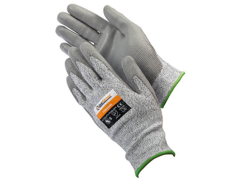 Harmaa työkäsine Polyuretaanipinnoitetulla kämmenellä, viiltosuojaluokka 5, suojaluokka 4.5.4.3. EN388. Koko 9