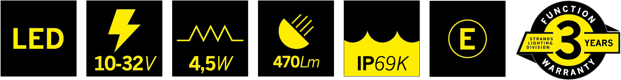 - Virrankulutus: työvalo: 4,5W, varoitusvalo: 3,8W