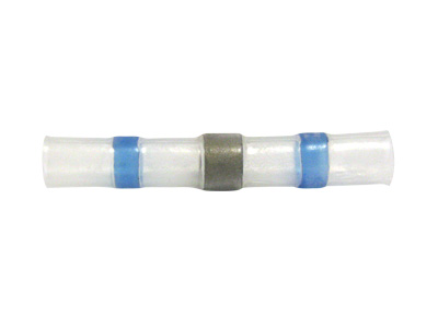 Autolinen sininen kutistejatkoliitin tinalla, sopii 1.5-2.5mm2 johdoille. Tina on liittimen keskellä, liitos tehdään lämmittämällä liitintä kuumailmapuhaltimella, tina sulaa ja "juottaa"...