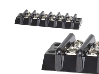 Blue Sean valmistama 6-osainen kytkentäkisko 65A. Kukin ruuvipari muodostaa yhden isoloidun virtapiirin. Suljettu rakenne eristää täysin virran asennuspinnalta.