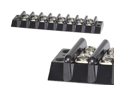 Blue Sean valmistama 8-osainen kytkentäkisko 65A. Kukin ruuvipari muodostaa yhden isoloidun virtapiirin. Suljettu rakenne eristää täysin virran asennuspinnalta.