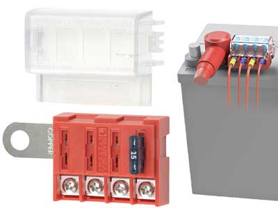 Kuvaus: 4xGM sulakkeelle akun plusnapaan kiinnitettävä rasia, tarrakoko sama kuin sarjassa 1790-8214. Max 30A/piiri, kokonaisvirrankesto 100A