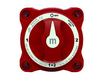 Perinteinen 4-toiminen 1-2-OFF-BOTH päävirtakytkin. Voidaan ohjata kuormitusta tai latausta kahden erillisen akkupankin välillä. Mahdollistaa kahden erillisen akkupankin yhdistämisen latausta tai hätäkäynnistystä varten. Tinatusta kuparista valmistetut kytkentäpultit takaavat maksimaalisen johtavuuden ja korroosiosuojan.