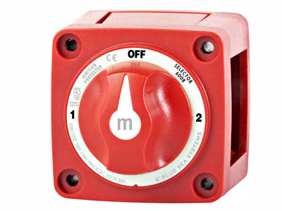 Päävirtakytkin, jossa on kaksi akkuliitäntää ja yksi ulostulos. Kytkee yhden akun, yhteen kuormakokonaisuuteen.