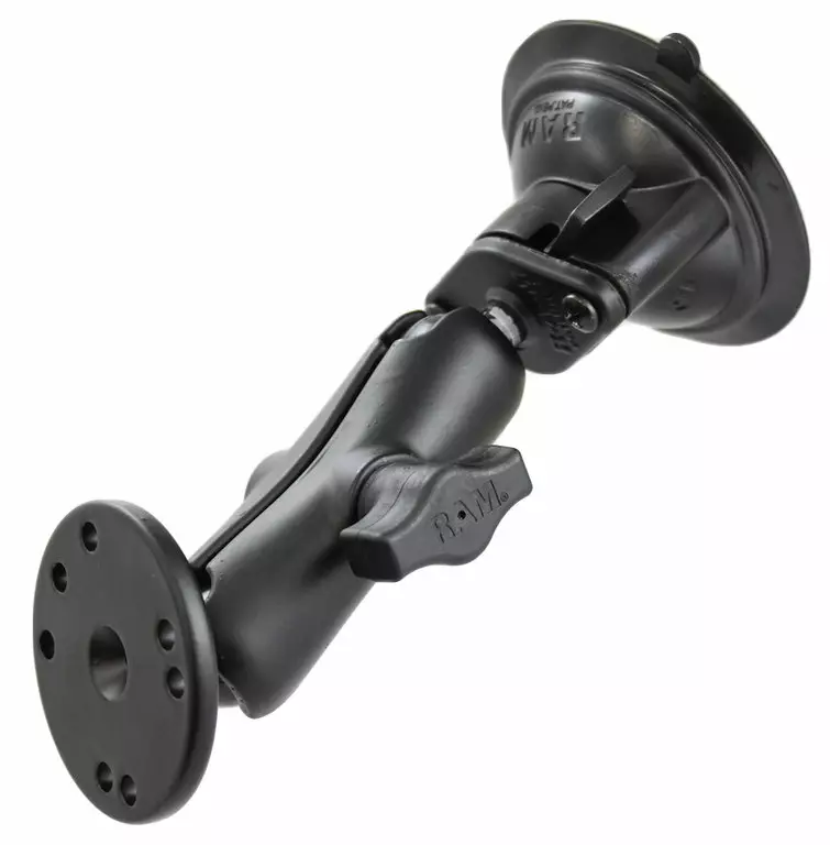 RAM-B-166-202U on imukuppikiinnikkeellä varustettu kiinnityssarja. Lisäksi sarjassa on käytetty keskimittaista kiinnitysvartta ja yleisintä pyöreää kiinnityspohjaa.
