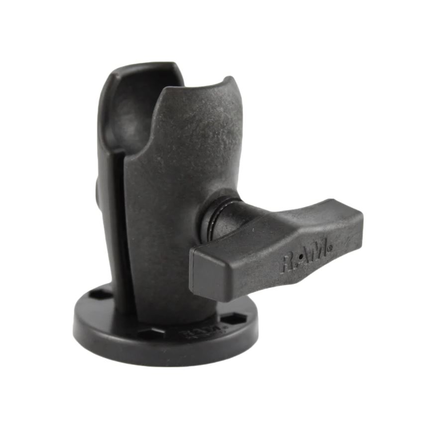 Ram Mounts valmistama komposiittinen kiinnike. Pyöreäpohja jossa lyhyt kiinnitysvarsi.