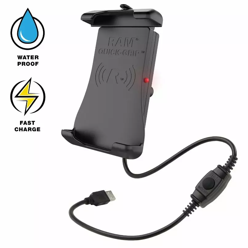 RAM-HOL-UN14WB-1 Quick-Grip puhelinteline on varustettu 15W vesitiiviillä Qi langattomalla laturilla. Pidikkeen rakenne mahdollistaa käytön yhdellä kädellä. Telineen päätykupit ovat päällystetty kumilla, joka auttaa pitämään puhelimen tukevasti paikallaan. Virtakaapelissa on kytkin, jonka avulla voit sammuttaa langattoman latausmoduulin, kun sitä ei käytetä.