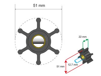 copolymer neopreeni (MC), huviveneisiin, Jabsco, Johnson, Volvo Penta. ISO9001, 51x12.7x22mm, 52g