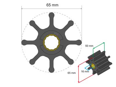 copolymer neopreeni (MC), huviveneisiin, Jabsco, JMP, Johnson Pump, Sherwood, Volvo Penta, Yanmar. ISO9001, 65x16x50mm, 176g