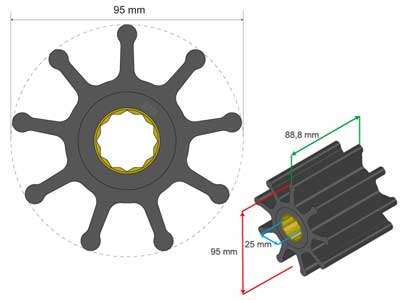 copolymer neopreeni (MC), ammattiveneisiin, Jabsco, JMP, Johnson Pump, Volvo Penta, Yanmar. ISO9001, 95x25x88.8mm, 586g
