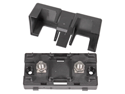 Sulakerasia yhdelle Mega/Powerval sulakkeelle. Suojakannessa liitinlähdöt molemmilla puolilla.